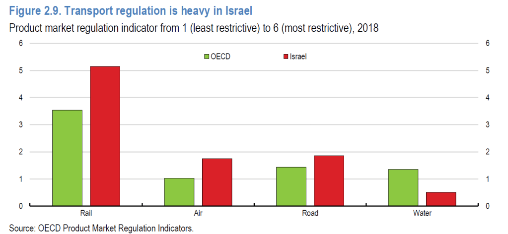 בתחום התחבורה, ה-OECD מותח ביקורת על הרגולציה הנוקשה בתחום הרכבת (בה פועל רק שחקן אחד), ומשווה אותה לרפורמה בתחום האוטובוסים, שבין 2004-ל-2014 נפתח להרבה מפעילים. ישראל מתאפיינת בעומס רגולציה בכל הענפים התחבורתיים חוץ מאחד – תחבורה ימית.