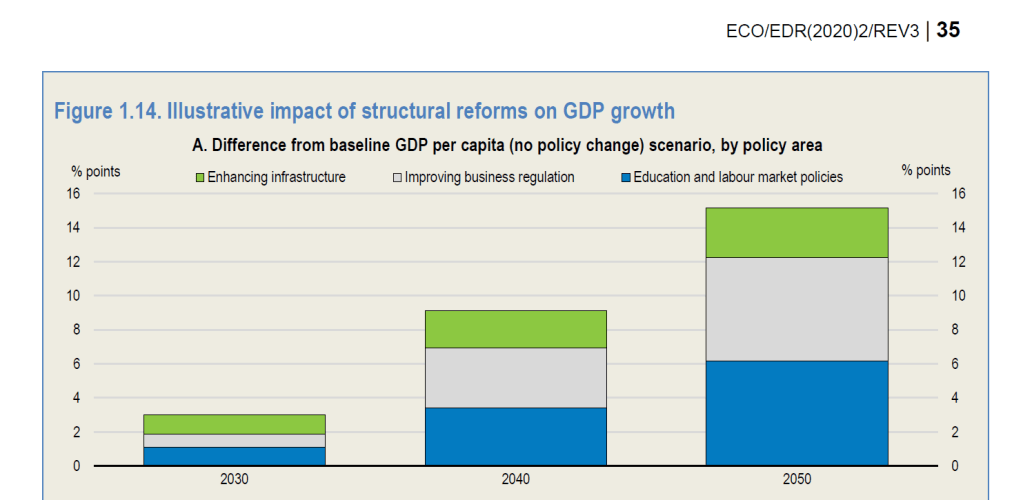 ה-OECD משווה במאקרו בין שלוש אסטרטגיות מומלצות לישראל: שיפור התשתיות, שיפור הרגולציה והשקעה בחינוך ומדיניות תעסוקה. בגרף הזה אפשר לראות את התרומה של כל אסטרטגיה כזו להגדלת התמ"ג – אם ישראל תפעל לפי המלצות ה-OECD בתחום הרגולציה, זה יגדיל את התמ"ג ב-1% עד 2030 וב-6% עד 2050.