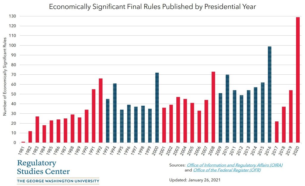 חלק ניכר מתכנית העבודה של ממשל טראמפ לשנת 2020 הייתה דווקא הוספת רגולציה ולא הפחתה או ביטול של רגולציה. וזה גם מה שקרה בפועל. בואו נסתכל על הרבעון האחרון שלו בבית הלבן. בין ה-1 לאוקטובר ועד ה-11 לינואר, הרגולטורים בארה"ב פרסמו 68 שינויי רגולציה שמהווים הפחתה ו-27 שינויים שמהווים הוספה של רגולציה. העלות המצטברת של כל השינויים האלו לציבור היא 39.1 מיליארד $ בשנה. הוא הטיל די הרבה עלויות בשביל מישהו שרק רוצה לבטל רגולציות.