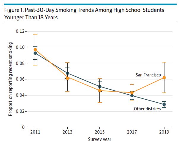 את הגרף הבא העתקתי מתוך המאמר. הוא מראה את השורה התחתונה – בכל המחוזות תופעת העישון של תיכוניסטים הייתה במגמת ירידה – אבל החל משנת 2018 המגמה התהפכה רק בסן פרנסיסקו ורק שם הנערים החלו לעשן יותר.