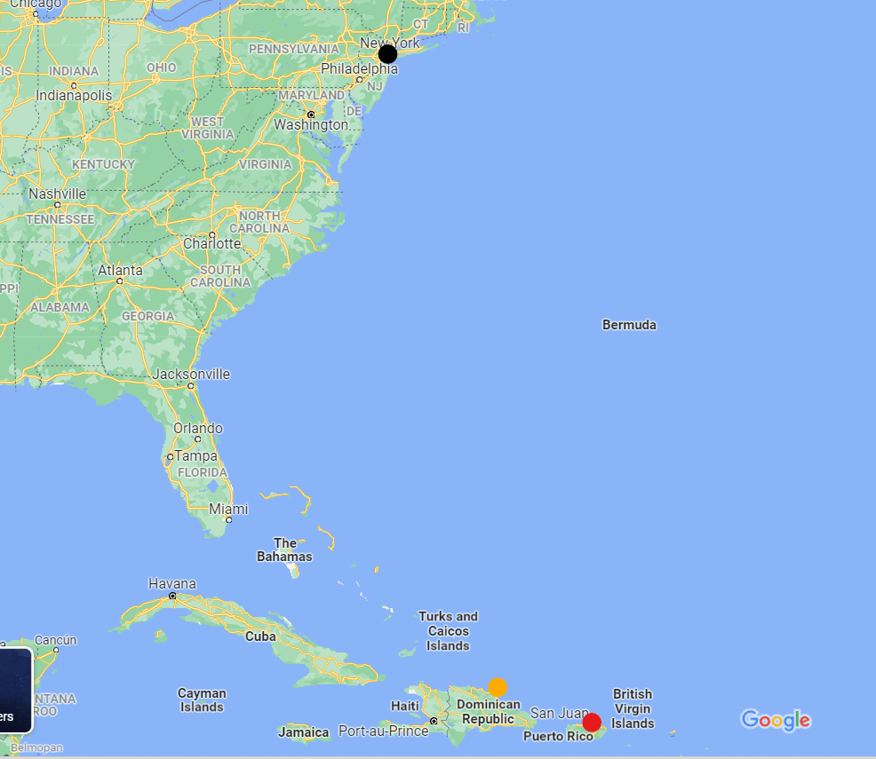 במפה אפשר להתרשם מהמרחק בין ניו-יורק (מסומנת בשחור) לבין פורטו ריקו (אדום) והרפובליקה הדומיניקנית (כתום). נראה פשוט לא הגיוני שמשלוח לפורטו ריקו עולה כפול ממשלוח לרפובליקה הדומיניקנית.