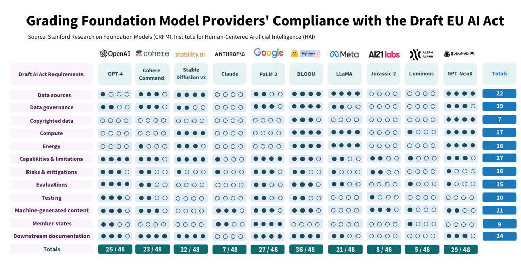 בשורה התחתונה – יהיה יקר וגם קשה אובייקטיבית לעמוד בכל הדרישות שבחוק. אפשר להתבונן על הפער בין המצב כיום לדרישות החוק. מכון מחקר באוניברסיטת סטנפורד בחן עד כמה כלי ה-AI המובילים כיום עומדים בהוראות החוק. המצב לא מזהיר: הכלי המצטיין (BLOOM) קיבל ציון של 36 מתוך 48 – שזה כמו לקבל 75 במבחן. Chat GPT קיבל 25 מתוך 48 – קצת יותר ממחצית הנקודות בלבד. וחשוב לזכור שכשמדובר על ציות לרגולציה – עמידה ב-75% או ב-52% מההוראות זה להיות עבריין. יש חשש אמיתי שהרגולציה האירופית תפגע קשה בהתפתחות הטכנולוגיה או תבריח את החברות מאירופה.