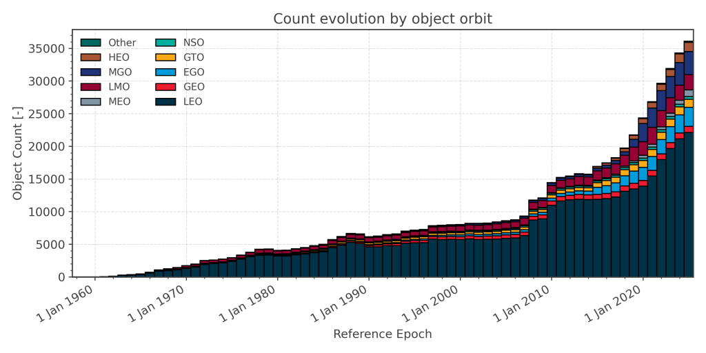 הגרף הבא מציג את הצטברות מספר הגופים המלאכותיים שמקיפים את כדור הארץ (כולל לוויינים לא פעילים וחלקי טילים ששימשו לשיגור שלהם לחלל).