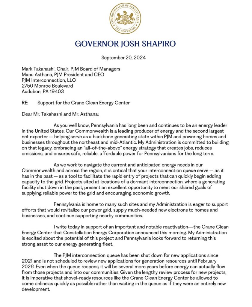 מושל פנסילבניה, ג'וש שפירו, כתב מכתב ובו ביקש לבחון באופן מיידי את הבקשה להפעיל את תחנת הכוח הגרעינית של Crane Clean Energy. למתעניינים, זו התחנה שהייתה ידועה בעבר כ- Three Miles Island.
